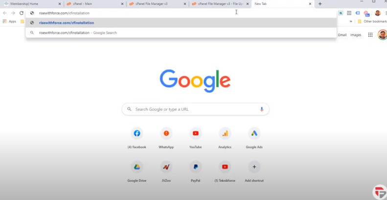 - In a new tab, I will type my domain name i.e risewithforce, and will put the file name which was inside the public_htmli.e cf installation
