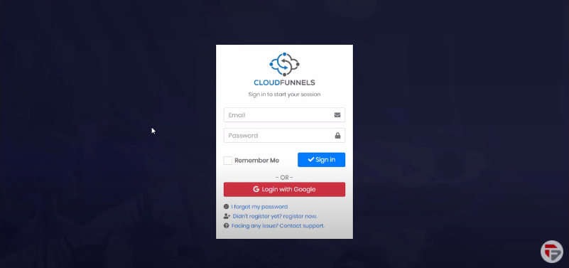 Go to cloudfunnels.in and you will be shown a login screen where you can log in. You can log in through google or fill up your email and password.