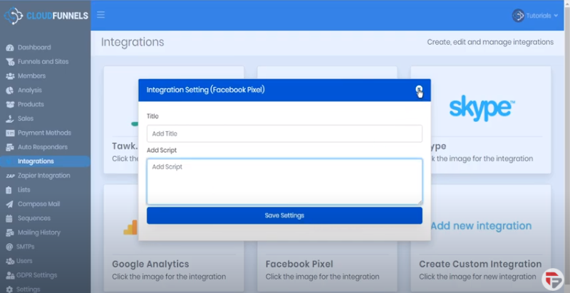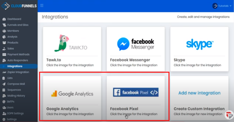 You will see various integrations that Cloudfunnels supports including two of the most advanced analytic tools available i.e, Google Analytics and Facebook Pixel
