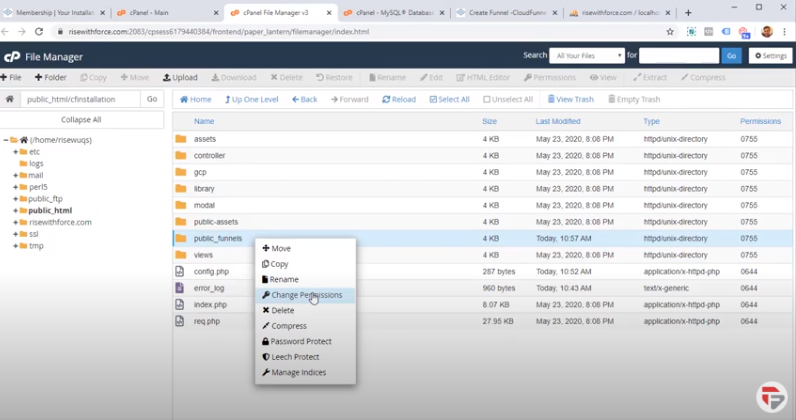 Now you need to give cloudfunnels or your server the right permission by default. We can do that by right-clicking on public_funnels