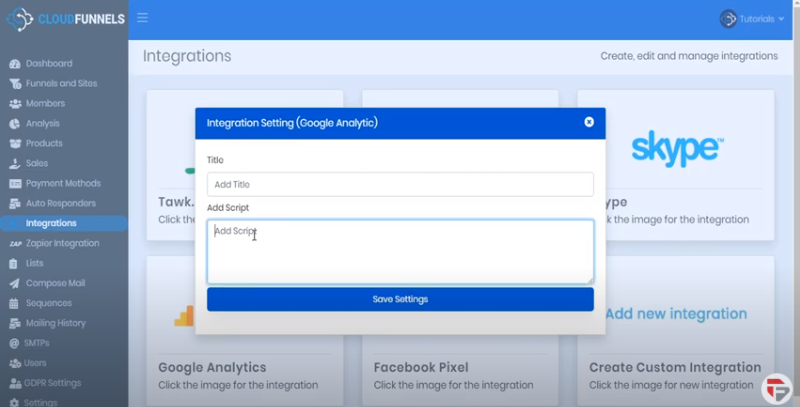 You will see various integrations that Cloudfunnels supports including two of the most advanced analytic tools available i.e, Google Analytics and Facebook Pixel